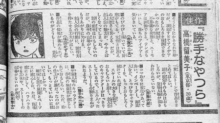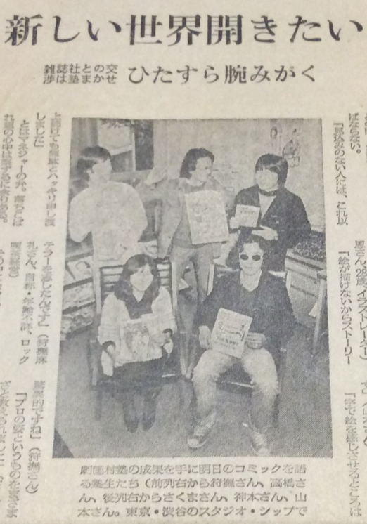 Mainichi Shimbun has a brief article and photo of the first graduating class of Kazuo Koike's Gekiga Sonjuku. Pictured from top left are: Atsushi Yamamoto, Kazuo Koike, Akira Sakuma, Marley Caribu, and Rumiko Takahashi.
